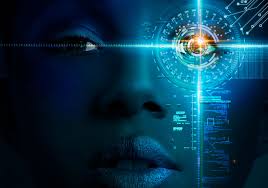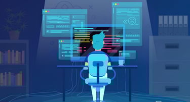 Tema warna yang digunakan adalah biru, ungu, dan hitam elegan dengan nuansa teknologi.